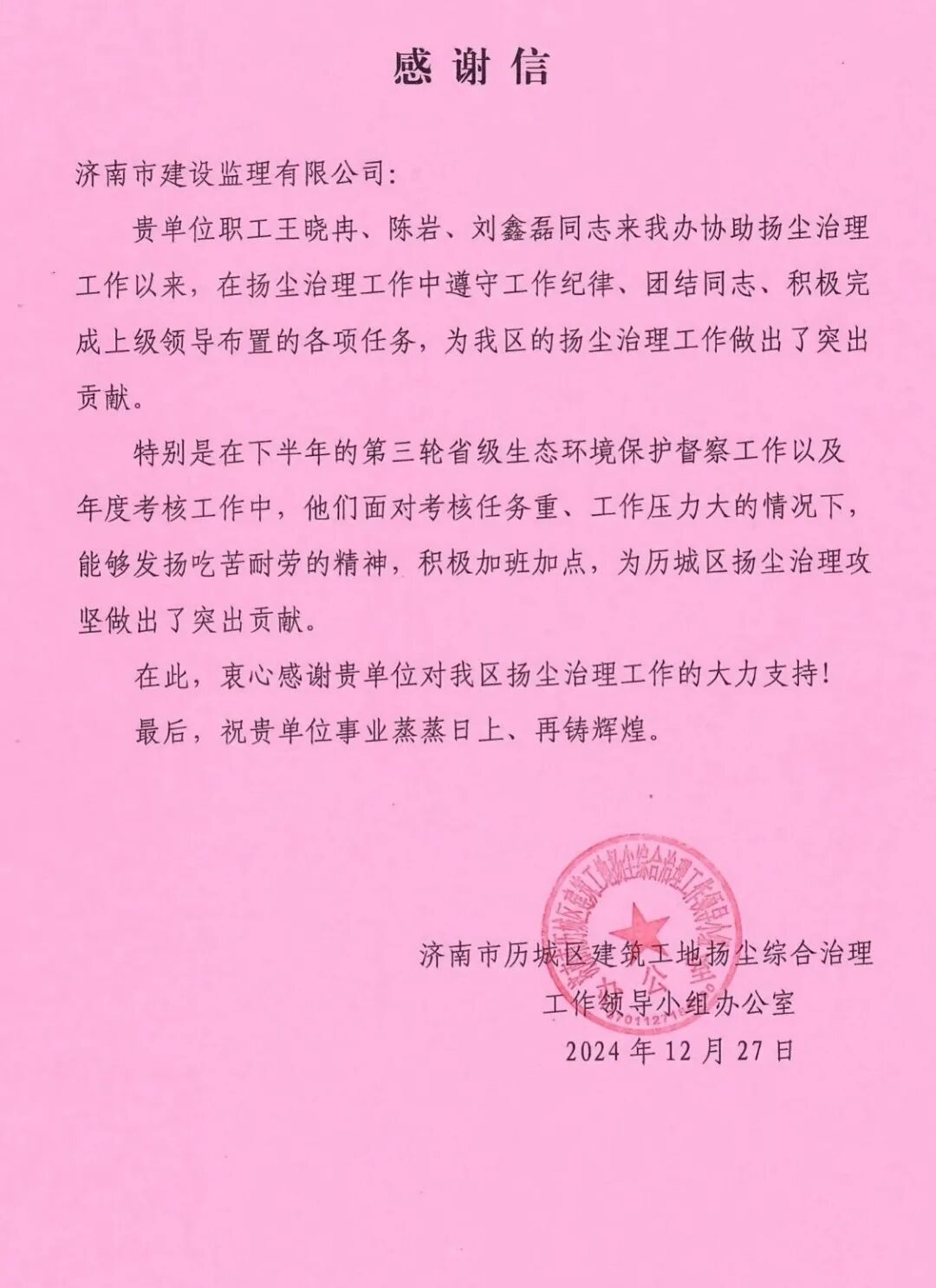近日,我公司歷城區(qū)住建局第三方巡檢項目收到了來自歷城區(qū)建筑工地揚塵綜合治理工作領導小組辦公室表揚信,信中對我公司項目工作人員的業(yè)務水平、責任心、組織協(xié)調(diào)能力給予充分肯定。